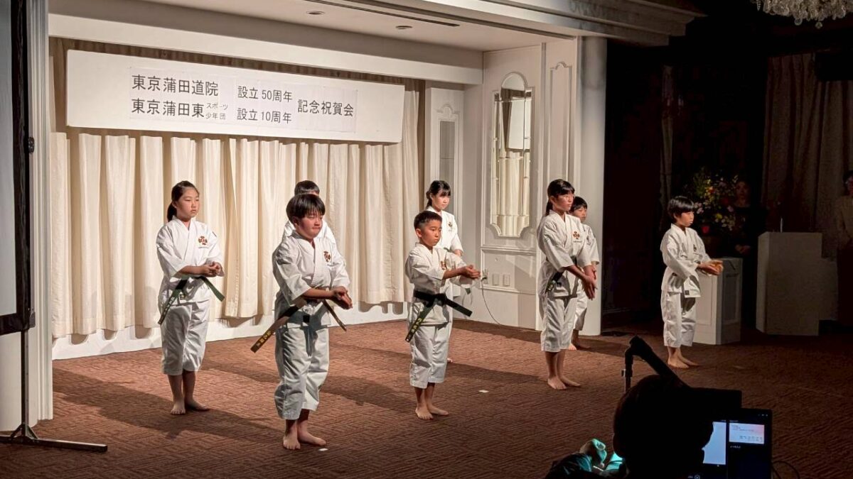 都大会1位の演武披露は、団体演武、親子演武(狩野純一、鈴士郎)、小学生自由演武(狩野鈴奈、山根佑太)の3組が披露